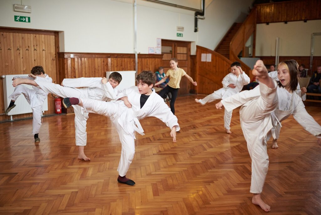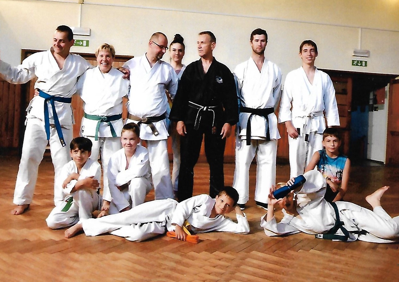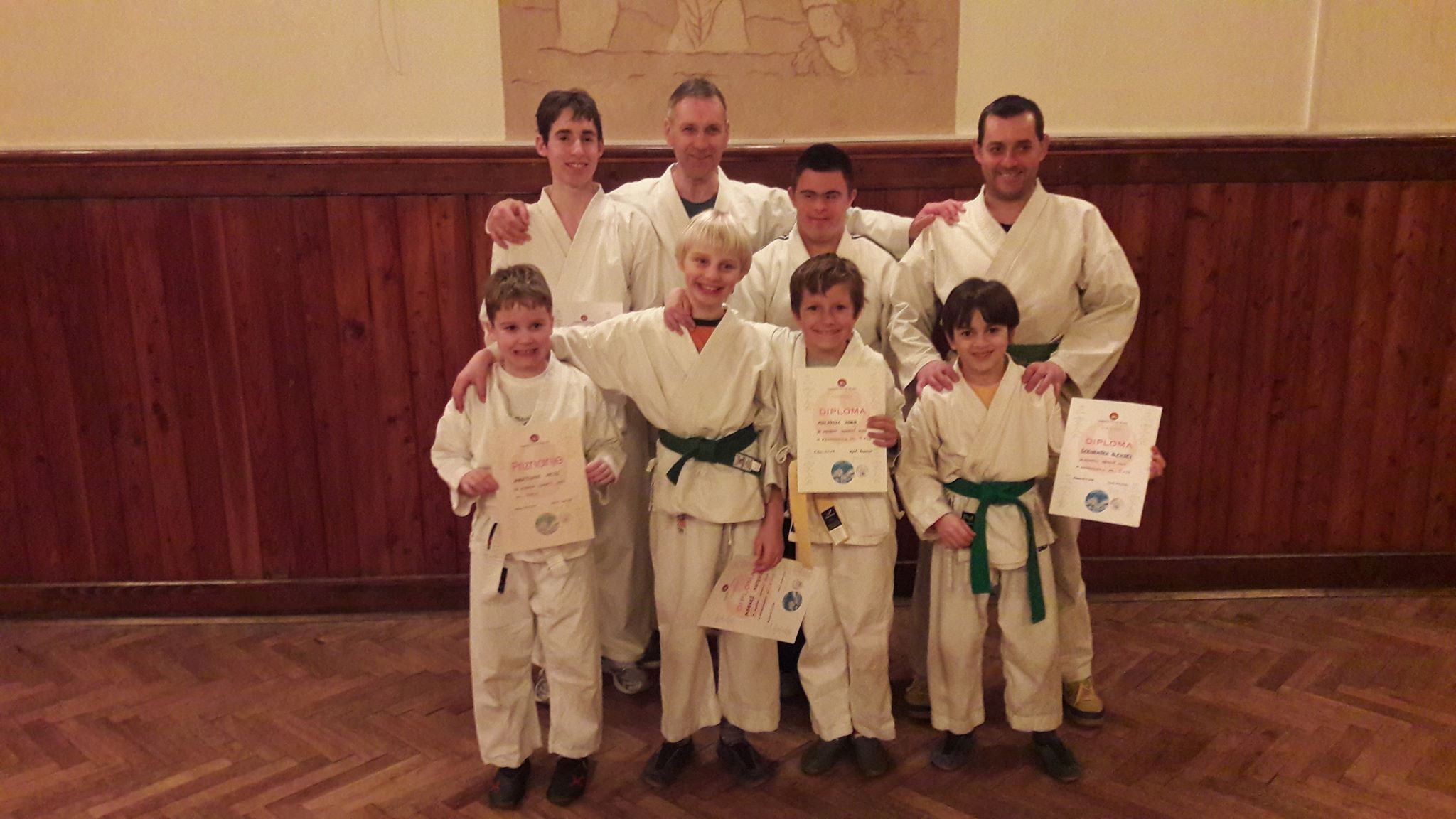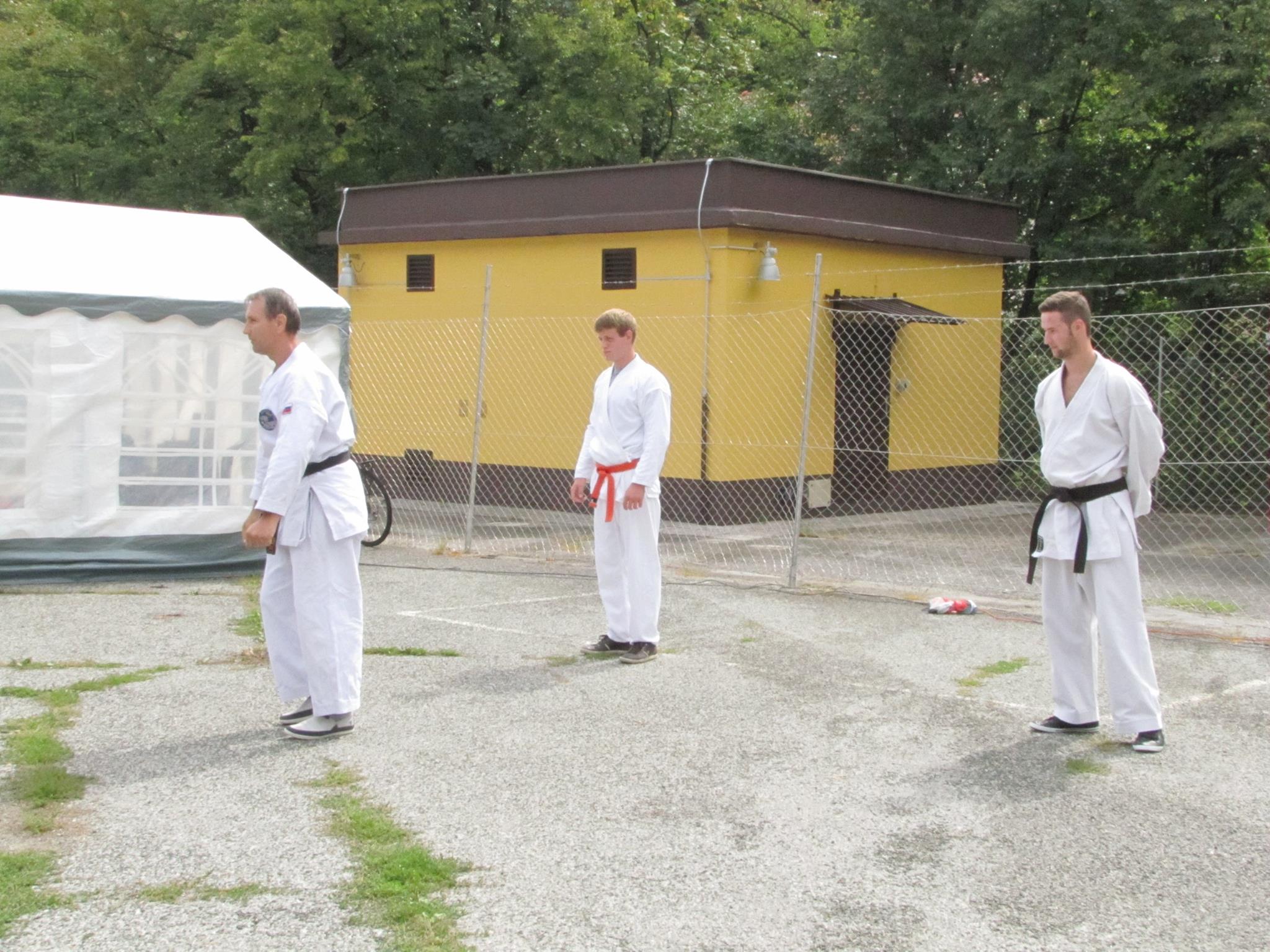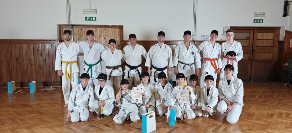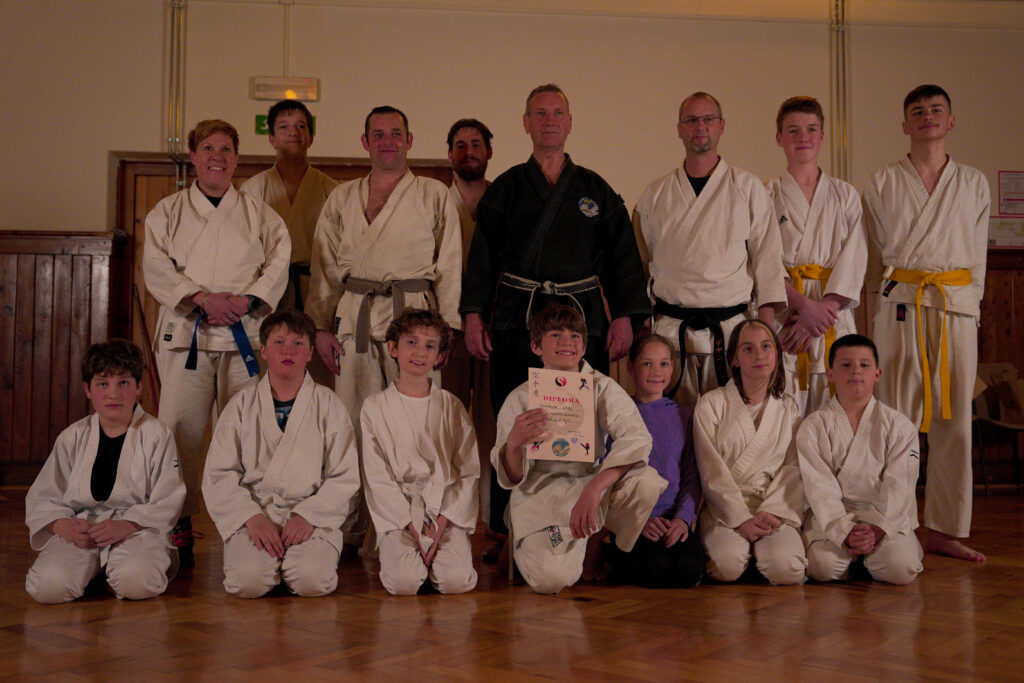 Karate klub Bled – v temni kimoni je mojster Vinko Guzej, na desni zraven njega trener Matej Kumerdej 1.DAN in povsem levo demonstrator Gregor Ulamec 1.KYUUspeh najmlajših po polaganju pasovIzpiti za pasove, Ribno 2023